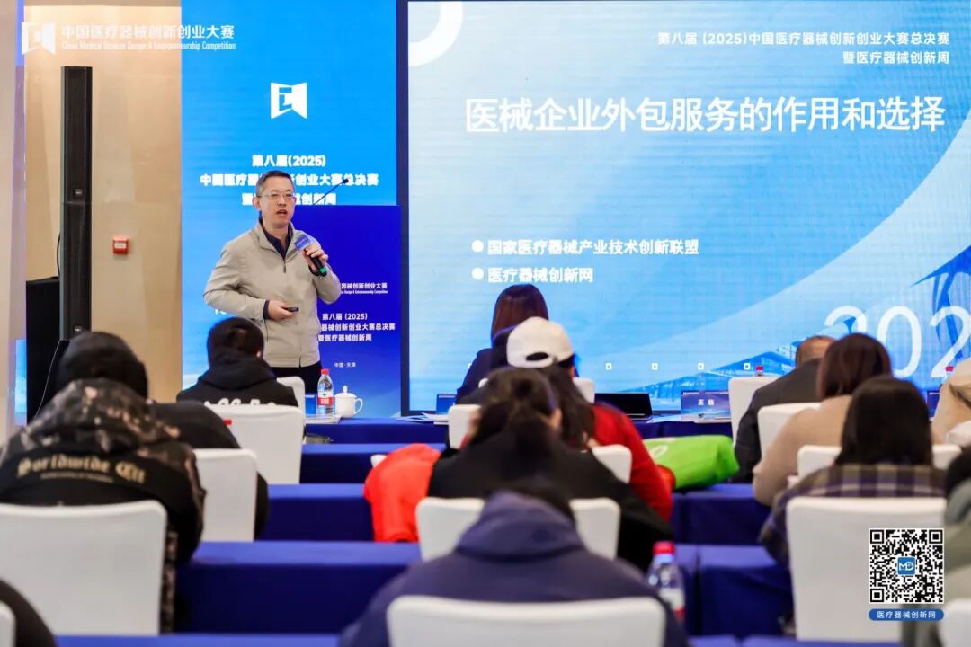 浙江国创医疗器械有限公司总经理王临聚焦医械企业外包服务展开分享。他先阐述了外包服务在降本增效、专业赋能、灵活适配、风险管控方面的核心优势,同时详解了依托行业联盟、协会及部委支持,以创新网和创新创业大赛为核心载体,整合多地实体基地、资本及行业资源,提供研发、生产、融资、出海等全生命周期服务(涵盖企业创新创业、机构合作、特色创业培训等)的平台体系,并且为企业选择外包服务给出了针对性建议。